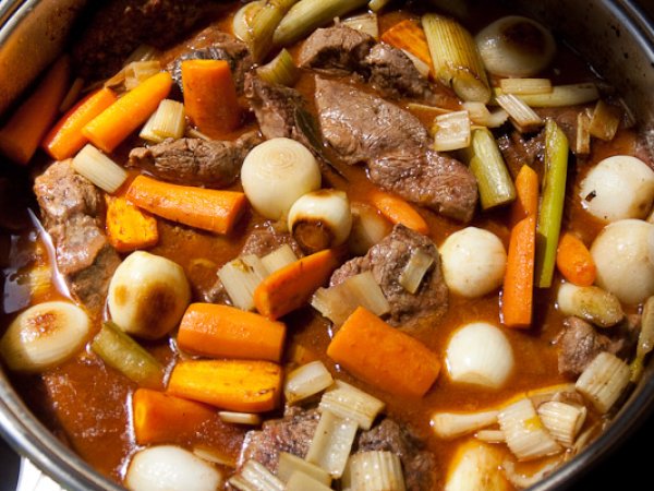 - Gemüse in etwas Olivenöl anbraten, dann das Fleisch hinzufügen. Das Bouquet von Kräutern auch hinzuzufügen. Sieden im Ofen für 30 Minuten insgesamt.
