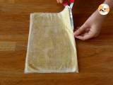 Die Filoblätter mit Butter bestreichen und übereinander legen. In der Mitte falten und an der Falte einschneiden, sodass 8 Blattschichten entstehen.