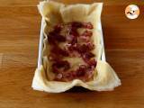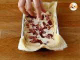 Schneiden Sie die Schinkenscheiben und die getrockneten Tomaten in kleine Stücke. Répartir la moitié de cette garniture sur le fond de tarte.