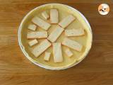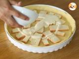 Legen Sie den Mürbeteig in eine zuvor gebutterte Kuchenform. Die Maroilles in nicht zu dicke Scheiben schneiden und auf dem Teig verteilen.