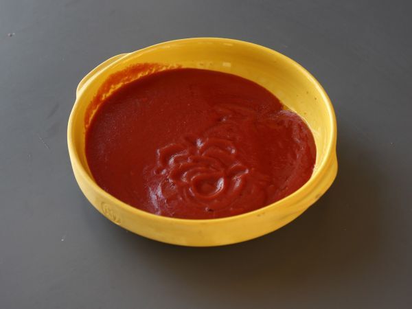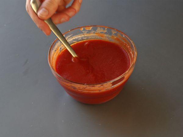 Tomatenpüree und Olivenöl verrühren und mit Salz und Pfeffer würzen.