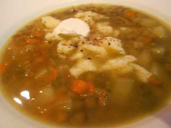 - Dunkle Sauce und das Gemüse in Brühe zu den Linsen geben, mit Essig und Salz abschmecken und aufkochen lassen. - Für die Spätzla :