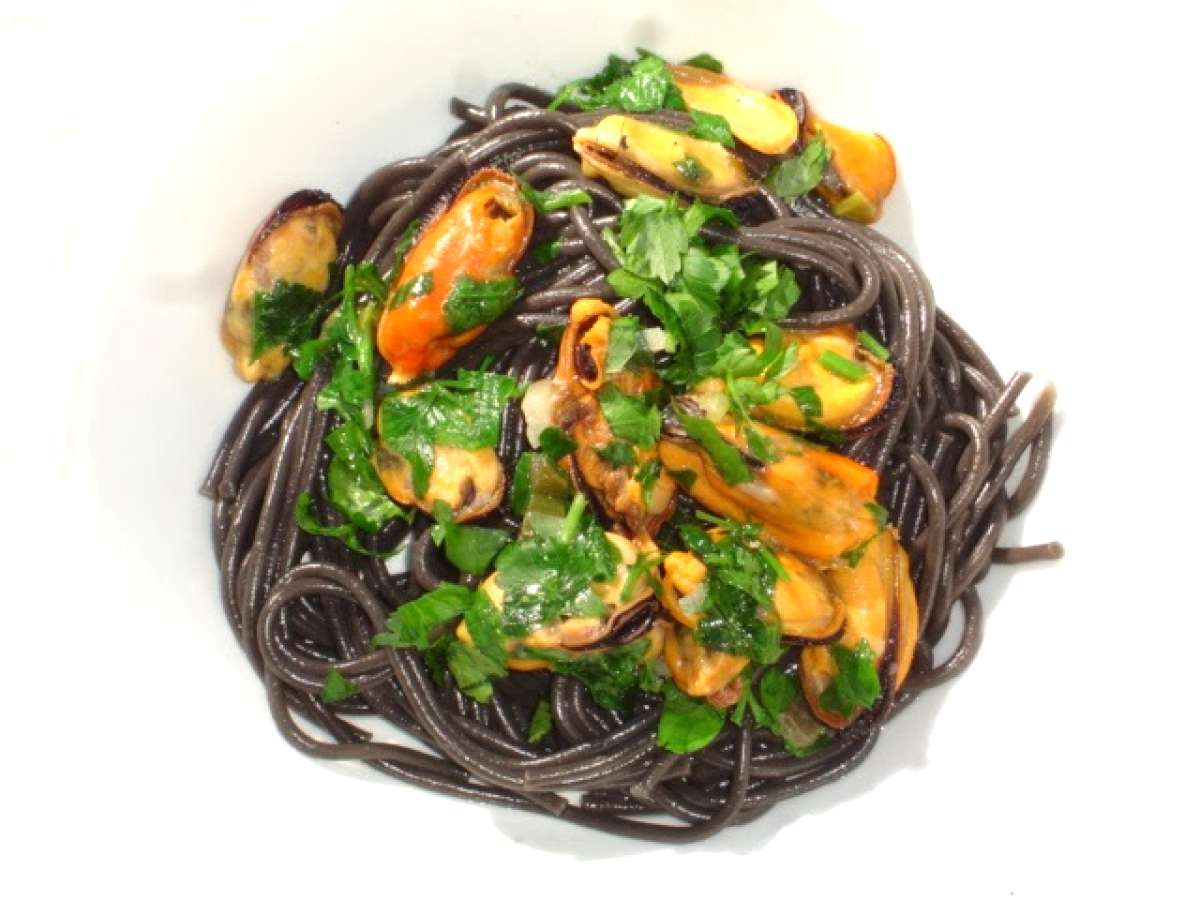 Schwarze nudeln mit miesmuscheln in weißwein-petersiliensauce