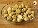 Halbieren Sie die Grenaille-Kartoffeln und legen Sie sie in eine Auflaufform. Einen Schuss Olivenöl darüber träufeln und mit Salz und Pfeffer würzen. Die zerdrückte Knoblauchzehe verteilen.