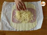 Rollen Sie den Blätterteig aus und schneiden Sie die Seiten ab, die wir für später aufbewahren. Die beiden Schinkenscheiben anrichten und mit geriebenem Käse bestreuen.