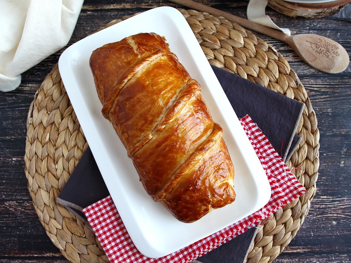 Aus den Blätterteigresten Zierstreifen formen und platzieren. Alles mit Eigelb bestreichen.