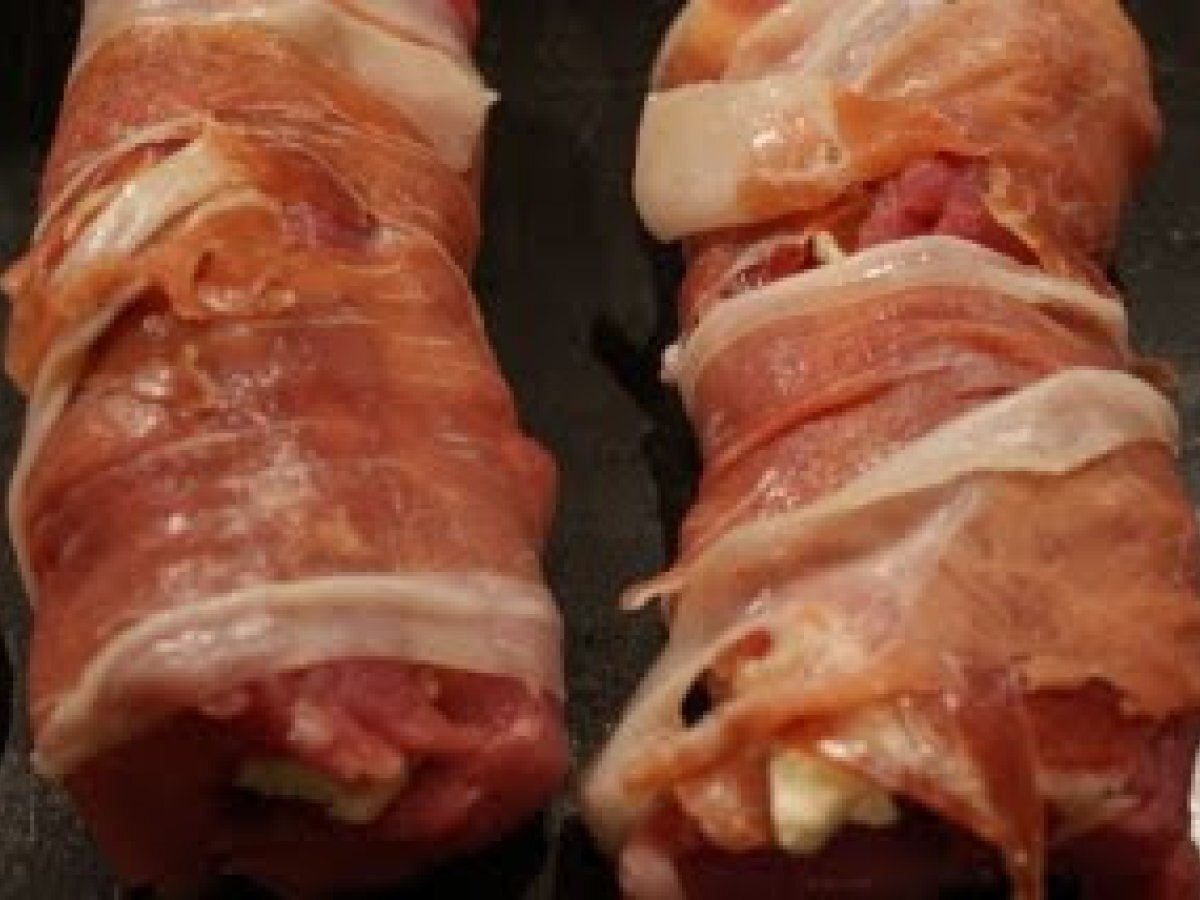 - Mit Boursin kneifen Nähe und wickeln mit je zwei Scheiben Schinken Serano.