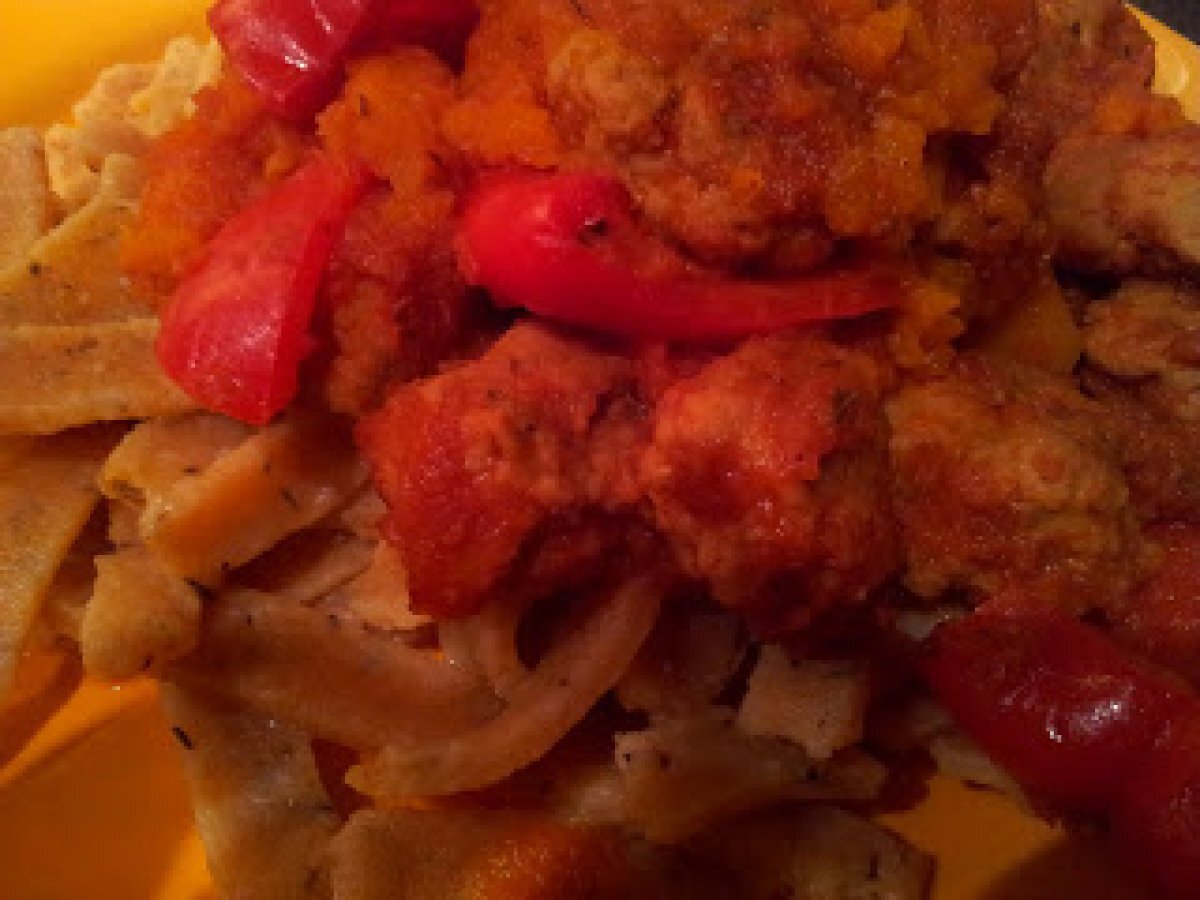 Seitangulasch mit kürbis und tomaten-thymian-nudeln