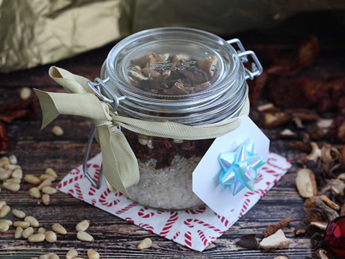 Die getrockneten Tomaten und die getrockneten Pilze in kleine Stücke schneiden. Den Reis in ein Glas geben, die Kräuter der Provence hinzufügen, dann die getrockneten Tomaten, dann die Pinienkerne und dann die Pilze. Das Glas verschließen.