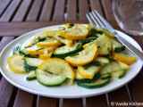 - Die Zucchini vierteln und in kleine Würfel schneiden. Die Karotte schälen und dann ebenfalls vierteln und in dünne Scheibchen schneiden. Die Frühlingszwiebel in Ringe schneiden.