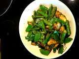 - Den Bacon in dünne Streifen schneiden. Nun das Olivenöl in einer Pfanne erhitzen und das Gemüse und die Hälfte der Frühlingszwiebeln darin anbraten.