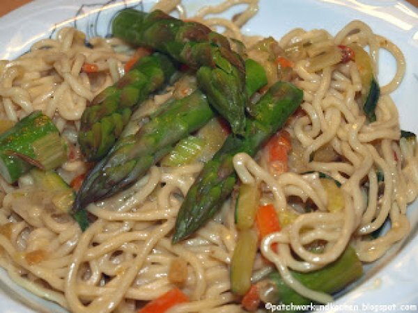 - Gemüse und Nudeln mischen. Mit Spargelspitzen.