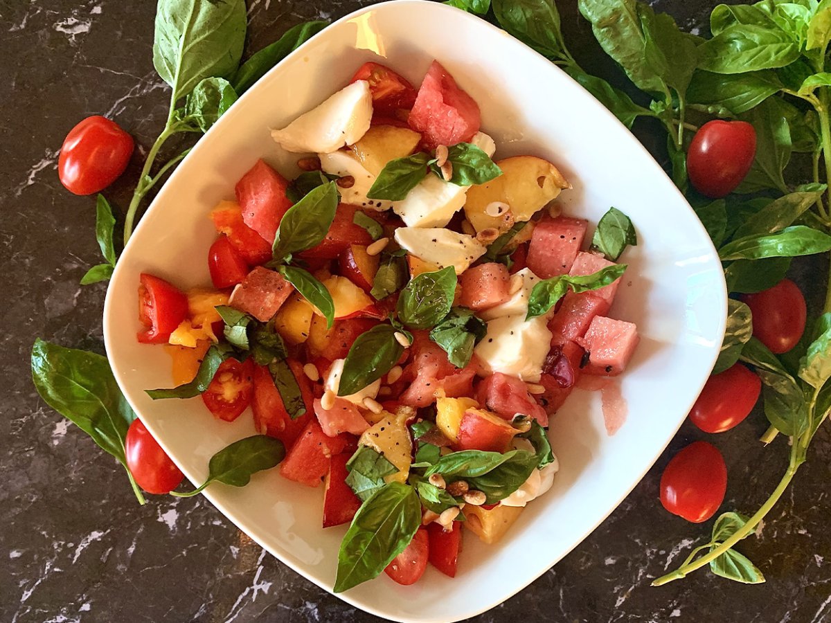 - Alle geschnittenen Zutaten auf einen Teller geben. Den Schuss Olivenöl, Salz und Pfeffer dazugeben. Einige Basilikumblätter klein schneiden und dazugeben. Alles miteinander vermischen.