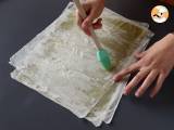 Betreichen Sie die Filo-Blätter mit Olivenöl, bevor sie übereinander gestapelt werden. Kleben Sie 4 Blätter zusammen und dann 2 Blätter zusammen.