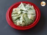 Die 4 geölten Filo-Blätter in den Boden der Form geben und den Belag einfüllen. Klappen Sie die Ränder der Blätter nach innen.