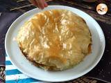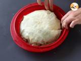Bedecken Sie die Form mit den beiden geölten Filo-Blättern und schneiden Sie alles um die Form. Geben Sie den Überschuss in die Form (Verschwendung wird somit vermieden). Legen Sie den Blattkreis auf die Oberseite und führen Sie die Kanten in die Form, um den Kuchen zu versiegeln.
