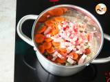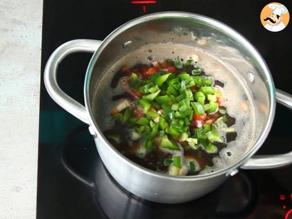 Die geschälte und in Stücke geschnittene Kartoffel und Tomate dazugeben. Fügen Sie außerdem die gehackten Paprika und Zwiebeln sowie die ganzen (und geschälten) Knoblauchzehen hinzu.