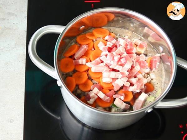 Die Karotte schälen und in dünne Scheiben schneiden. Fügen Sie es zusammen mit den Speckstücken zur Mischung hinzu. Mischen.