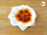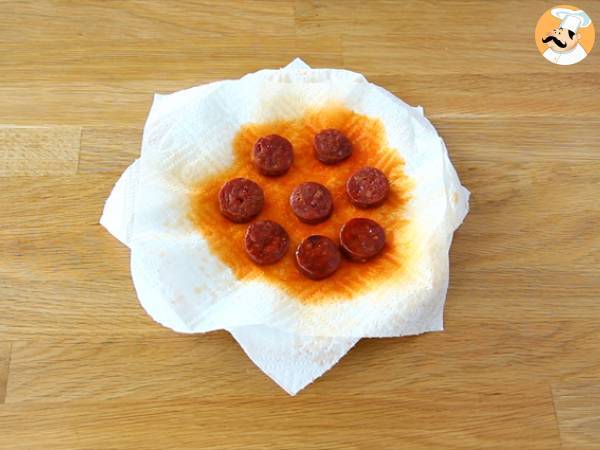 Die Chorizo-Stücke auf einen mit Küchenpapier ausgelegten Teller legen und für 1 Minute in die Mikrowelle stellen. Dadurch wird der Chorizo Fett entzogen.