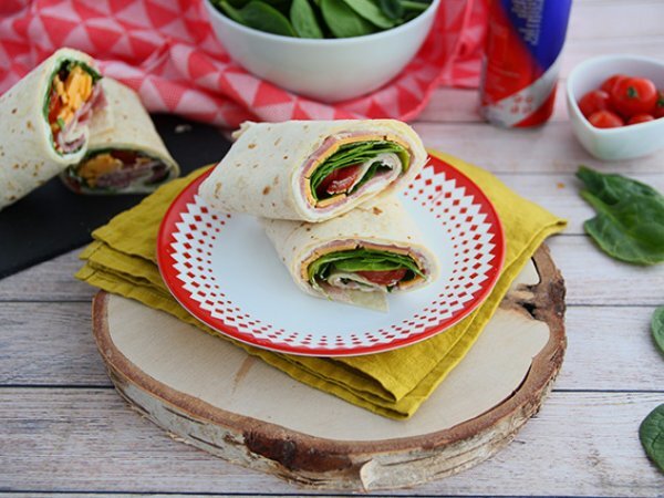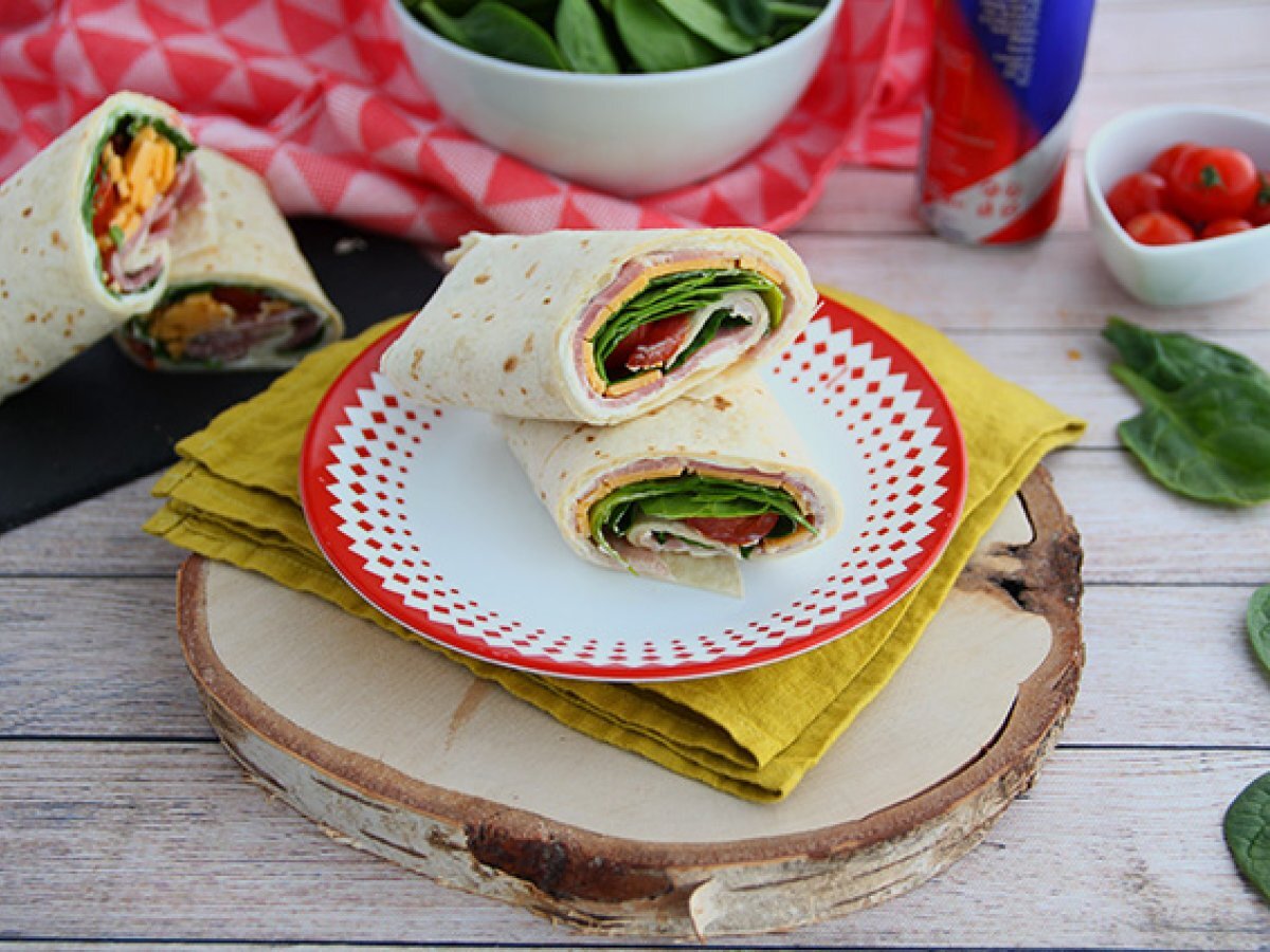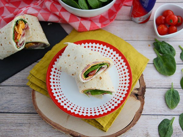 Probieren Sie für eine einfache, schnelle Mahlzeit ohne Kochen unsere Schinken-/Cheddar-Käse-/Spinat-Wraps! Ein leichteres Sandwich als die traditionellen, da das dicke Brot durch dünne und weiche Weizenpfannkuchen ersetzt wird. Nehmen Sie es mit auf ein Picknick oder in die Mittagspause auf der Arbeit. Und natürlich nutzen wir die Gelegenheit, unseren Wraps jede Menge rohes Gemüse und Gemüse hinzuzufügen, damit die ganze Familie sie unbemerkt verschlingt!
