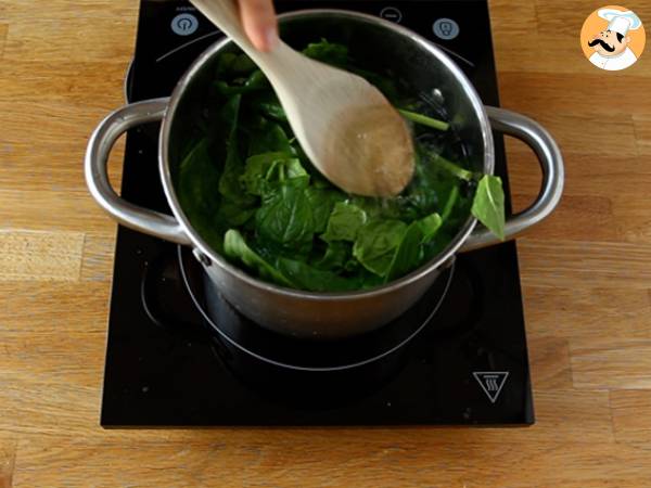 Den frischen Spinat in einem Topf mit kochendem Salzwasser 3 Minuten kochen. Gut abtropfen lassen.