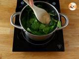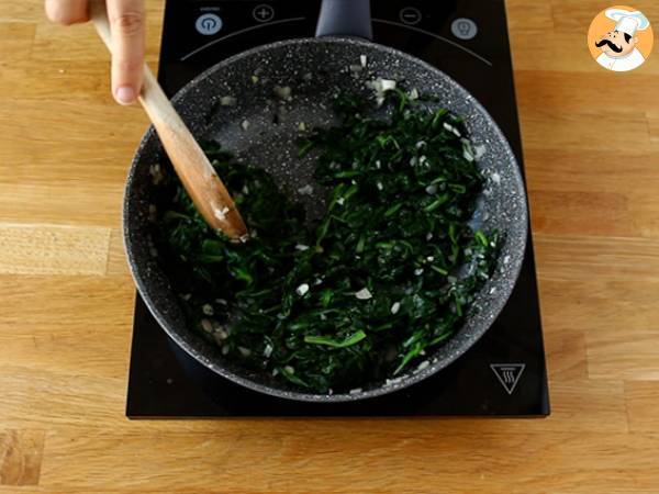 Die Schalotte und den gehackten Knoblauch in einer Pfanne mit Olivenöl anbraten. Den Spinat dazugeben und 5 Minuten bei schwacher Hitze unter Rühren anbraten.