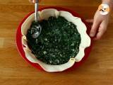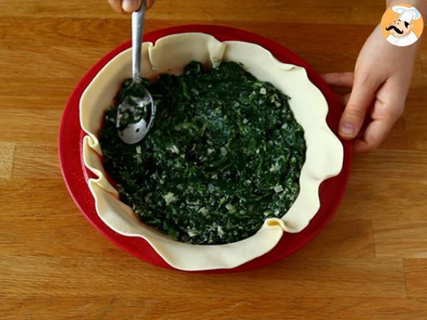 Einen Mürbeteig in einer gebutterten Form ausrollen. Die Spinatmischung im Teig verteilen.