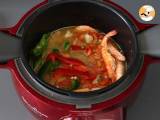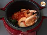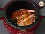 Paprika, Tomaten, Reis, Garnelen, Muscheln und Erbsen dazugeben.