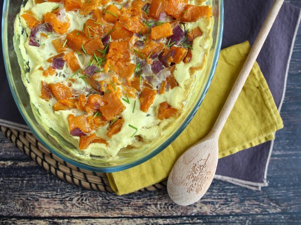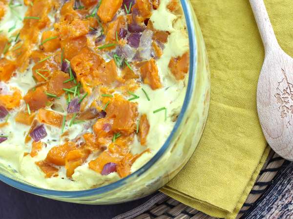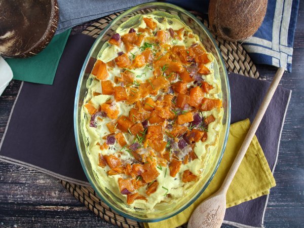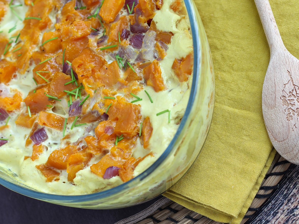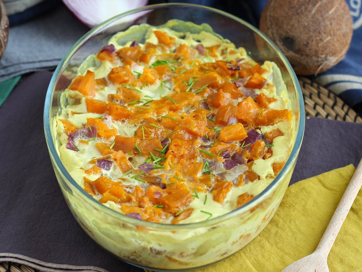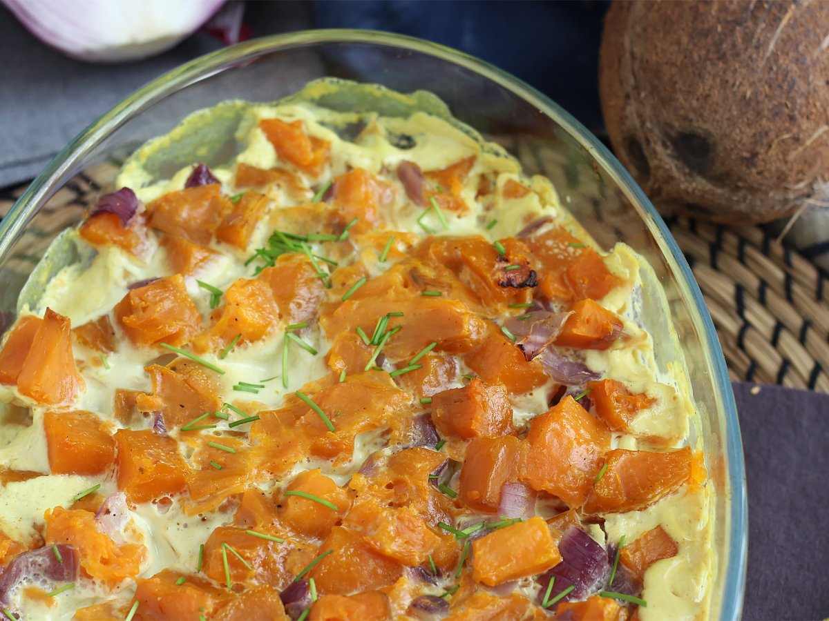 Süßkartoffelgratin, gewürzt mit kokosmilch und curry