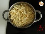Kochen Sie die Nudeln 1 Minute kürzer als angegeben in einer großen Menge Salzwasser. Die Nudeln abgießen.