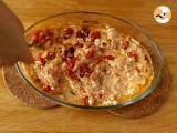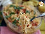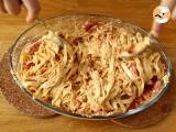 Die Nudeln in die Auflaufform geben und gut vermischen. Streuen Sie frischen Basilikum darüber.