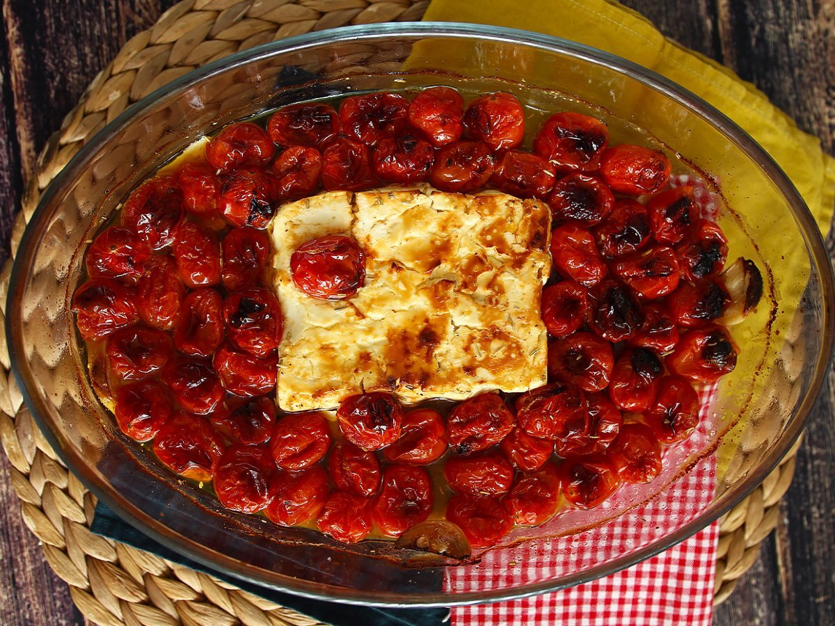Den Feta zerkleinern und mit den gerösteten Tomaten vermischen.