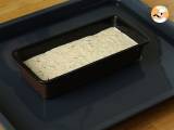 Gießen Sie die restliche Masse darüber und stellen Sie die Form in ein Wasserbad. Die Form mit Alufolie abdecken und 50 Minuten lang in den auf 180 °C vorgeheizten Ofen stellen.