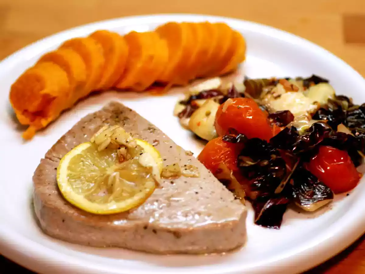 Thunfisch mit süßkartoffelfächer und gebratenem treviso