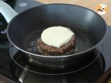 Die Zwiebelscheiben in Olivenöl 2 min auf jeder Seite braten. Das Steak 4 min braten, umdrehen, dann Mozzarella hinzufügen und 4 min braten.