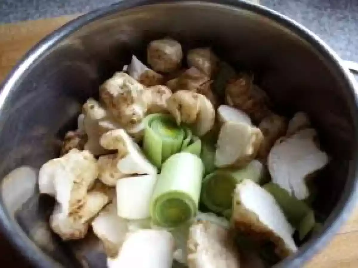 - 5 dicken Knollen, geschnitten1 in Stücke von Lauch, Sellerie in Stücke geschnitten1, stark in geschnitten1 Stücke Shaosingh Wein gezogen wird, mit kochendem Brühe oder Sherrymit 20 Minuten bei schwacher Hitze.