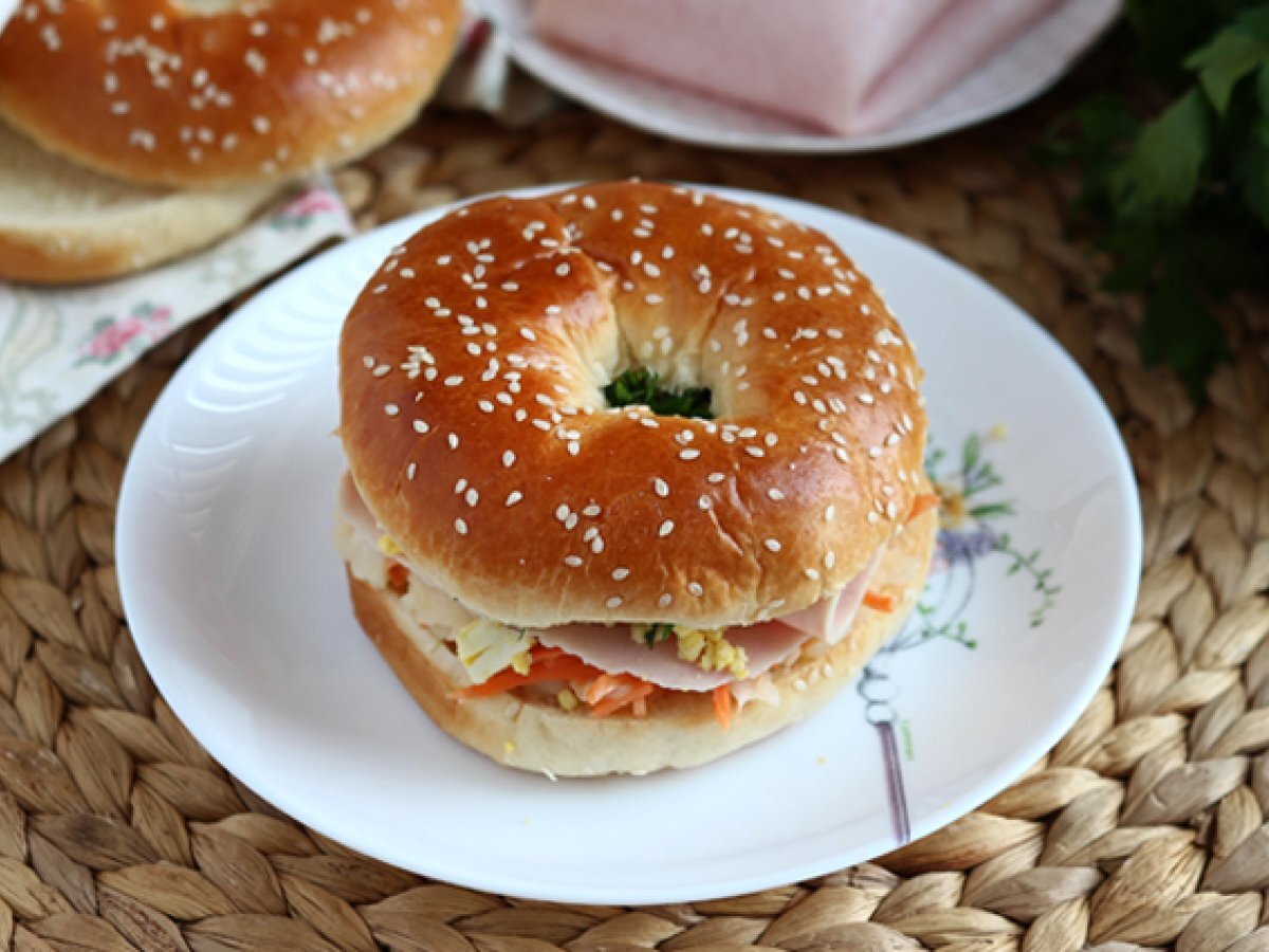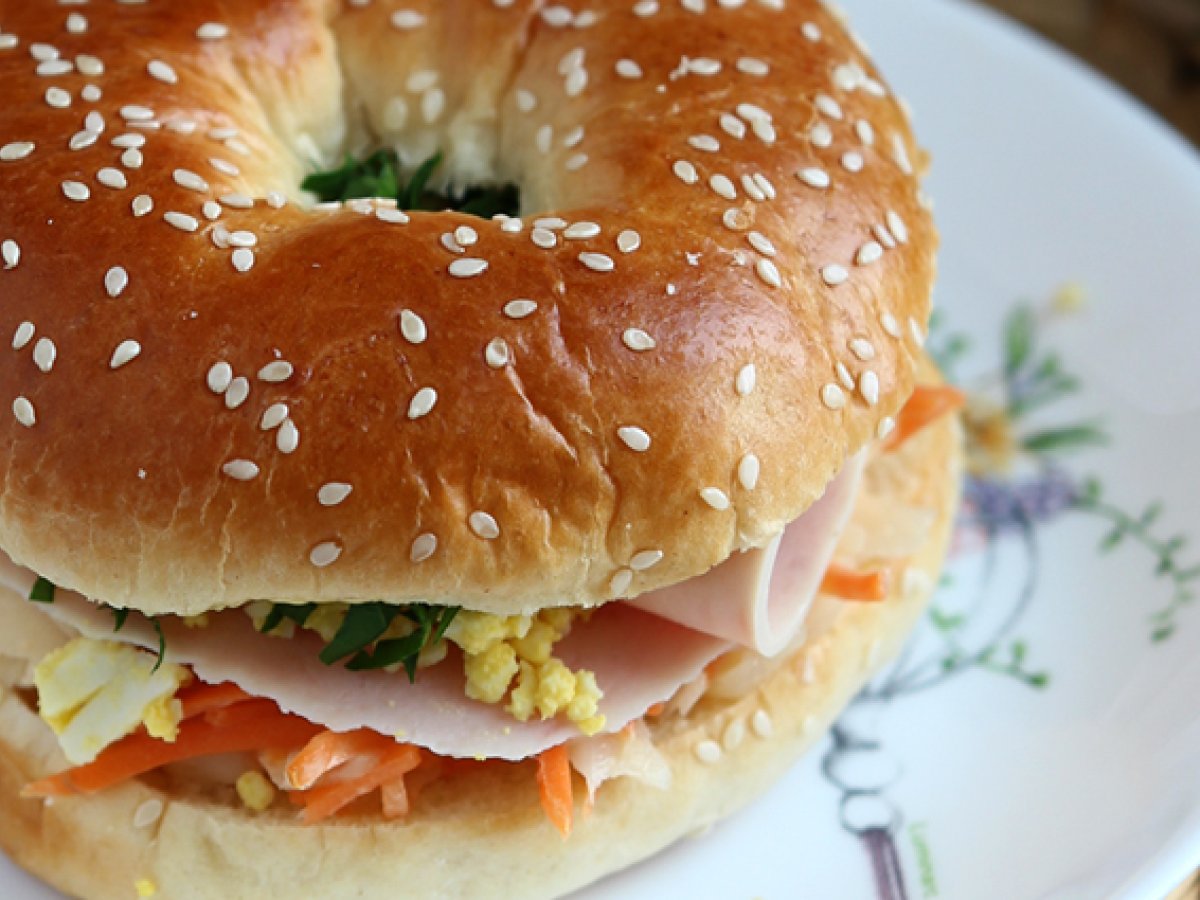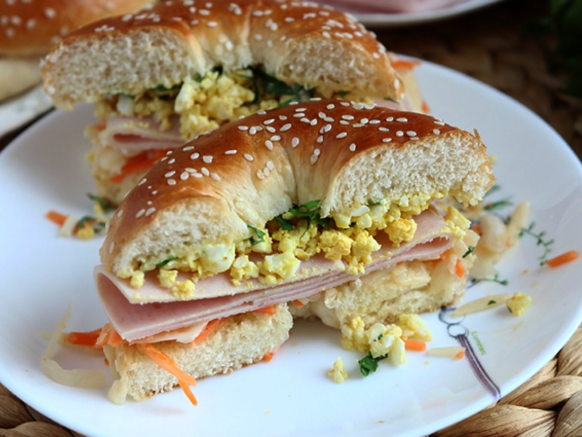 Truthahn-bagel-sandwich mit krautsalat und hartgekochtem ei