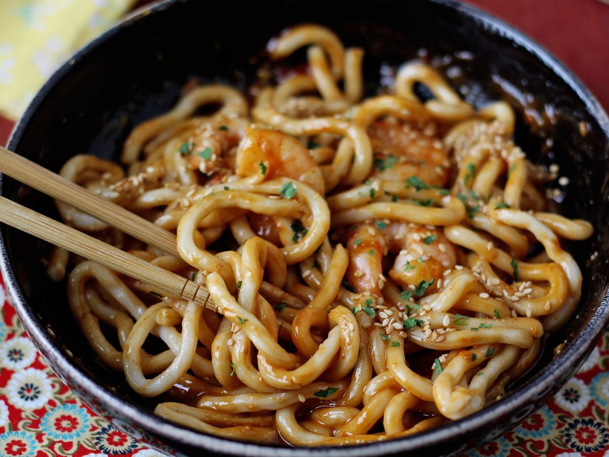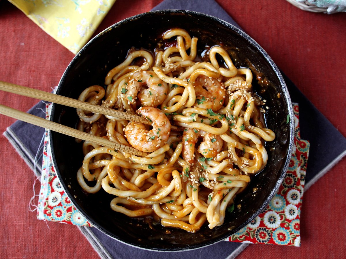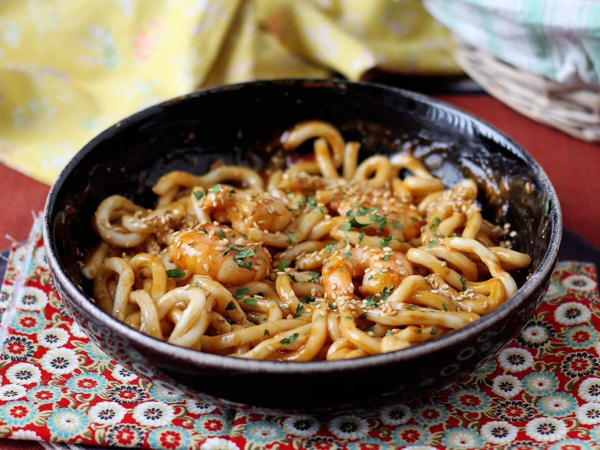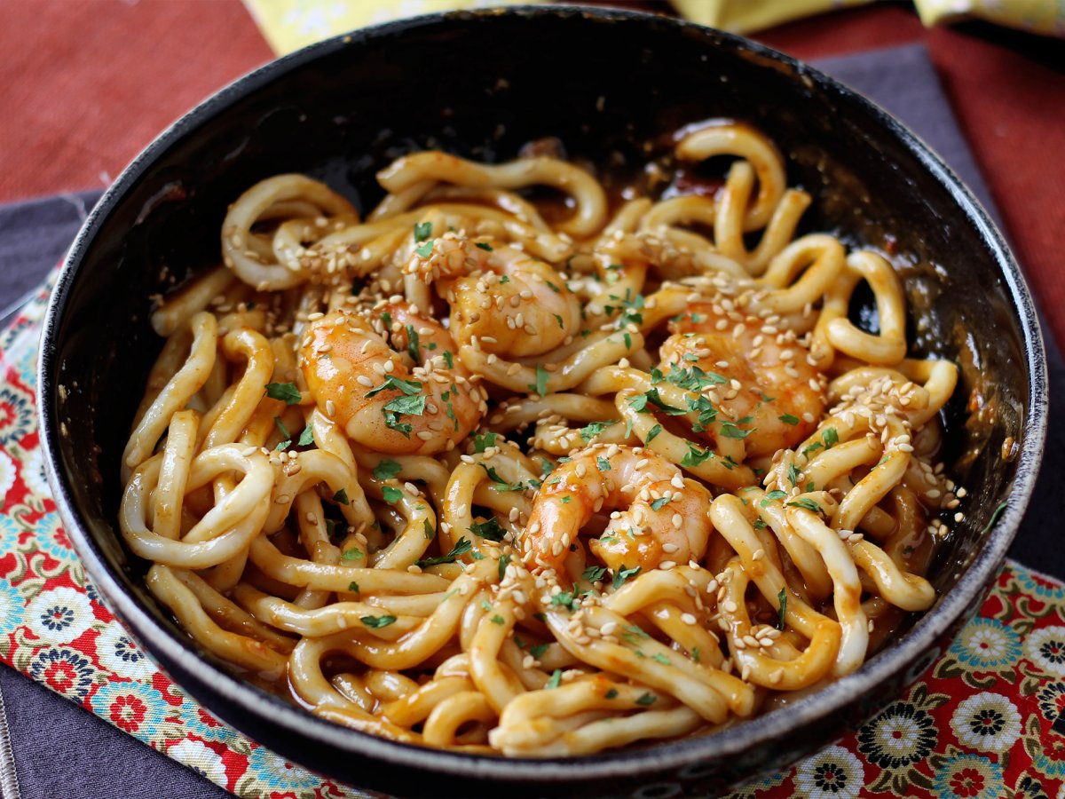 Udon-nudeln mit garnelen und scharfer erdnusssauce