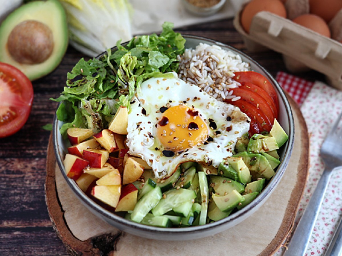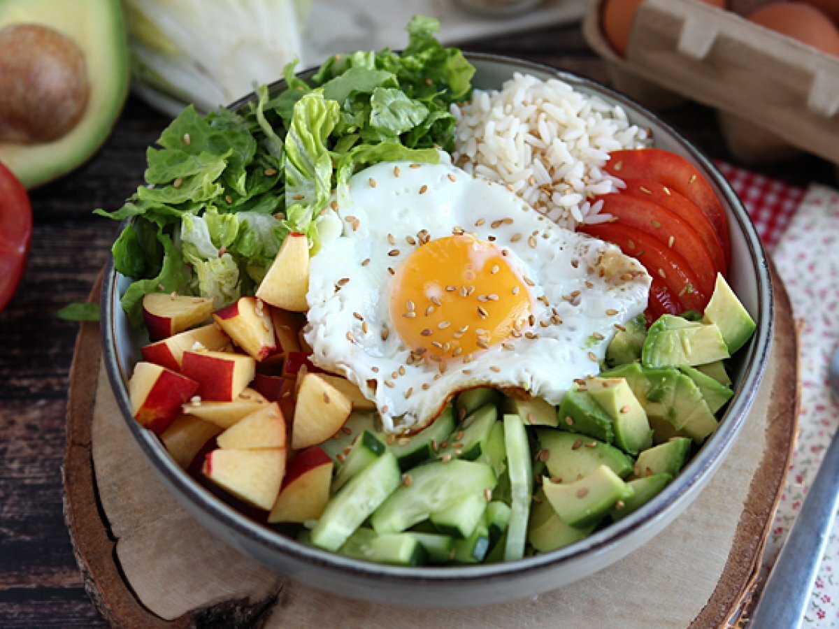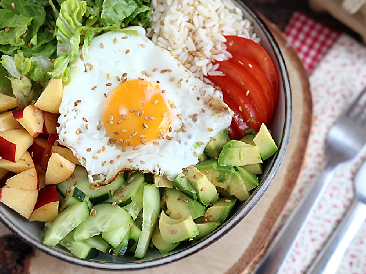 Bringen Sie mit dieser Buddha-Bowl die Sonne auf Ihren Teller! Hier gibt es nur Gutes: Stärke mit Reis, Obst und Gemüse und Proteine mit Avocado und Ei. Der Beweis, dass es möglich ist, sich gesund zu ernähren, indem man einfache und schnelle Rezepte macht ;-)