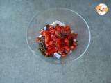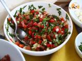 Bereiten Sie die mexikanische Salsa zu: Mischen Sie alle in kleine Stücke geschnittenen Zutaten. Den Zitronensaft und einen Schuss Olivenöl hinzufügen und würzen.