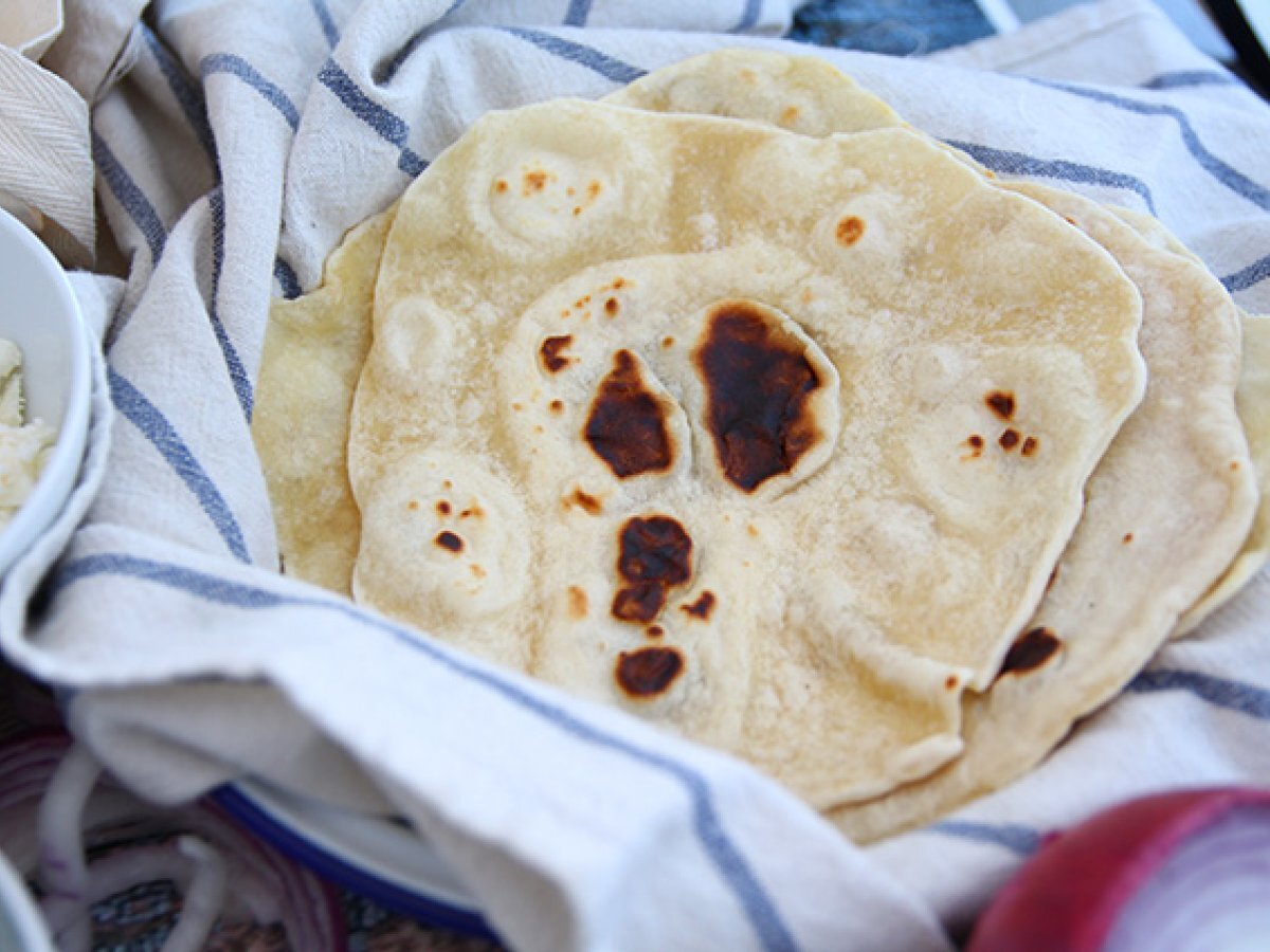Die Tortillas werden aus Mehl, Wasser und einer Prise Salz hergestellt. Einfach den Teig kneten, ausrollen und in einer heißen Pfanne backen.