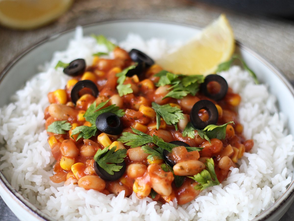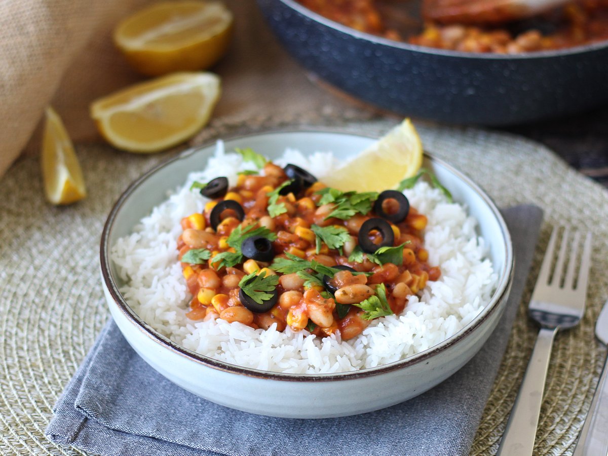 Lassen Sie Ihren Reis abtropfen und legen Sie ihn in einen tiefen Teller mit dem vegetarischen Eintopf in der Mitte.