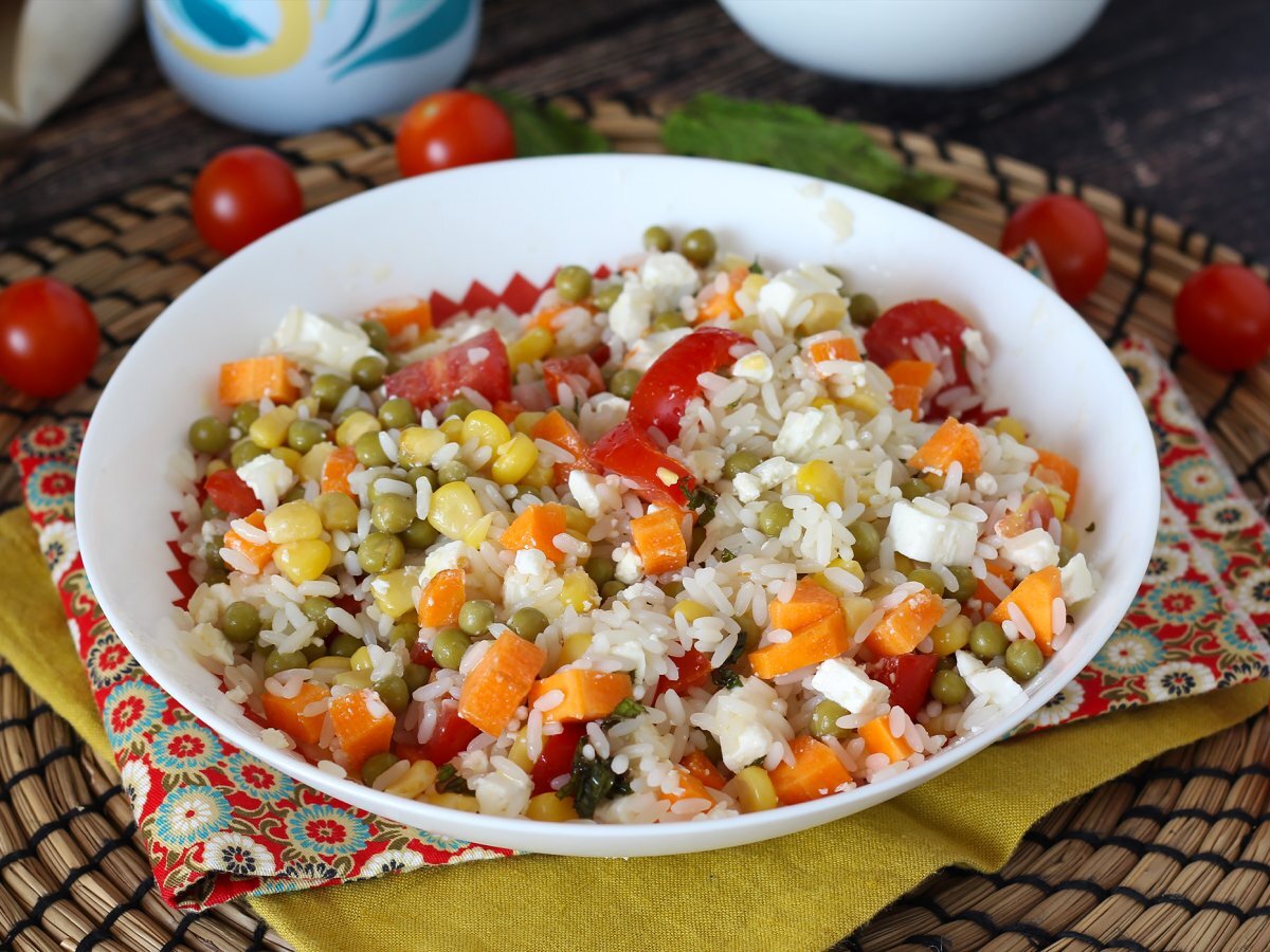 Vegetarischer reissalat: feta, mais, karotten, erbsen, kirschtomaten und minze