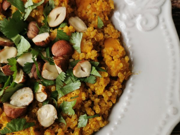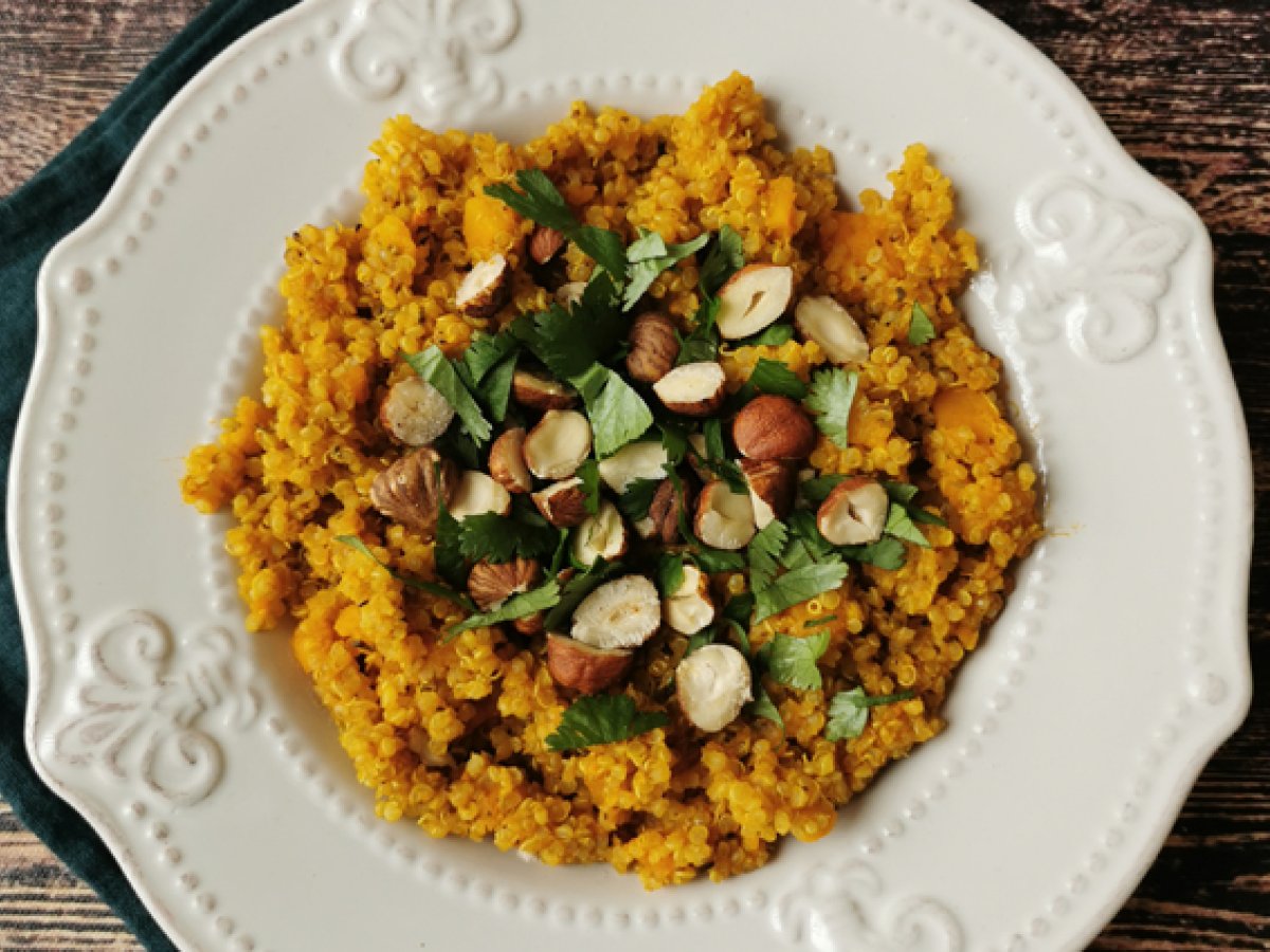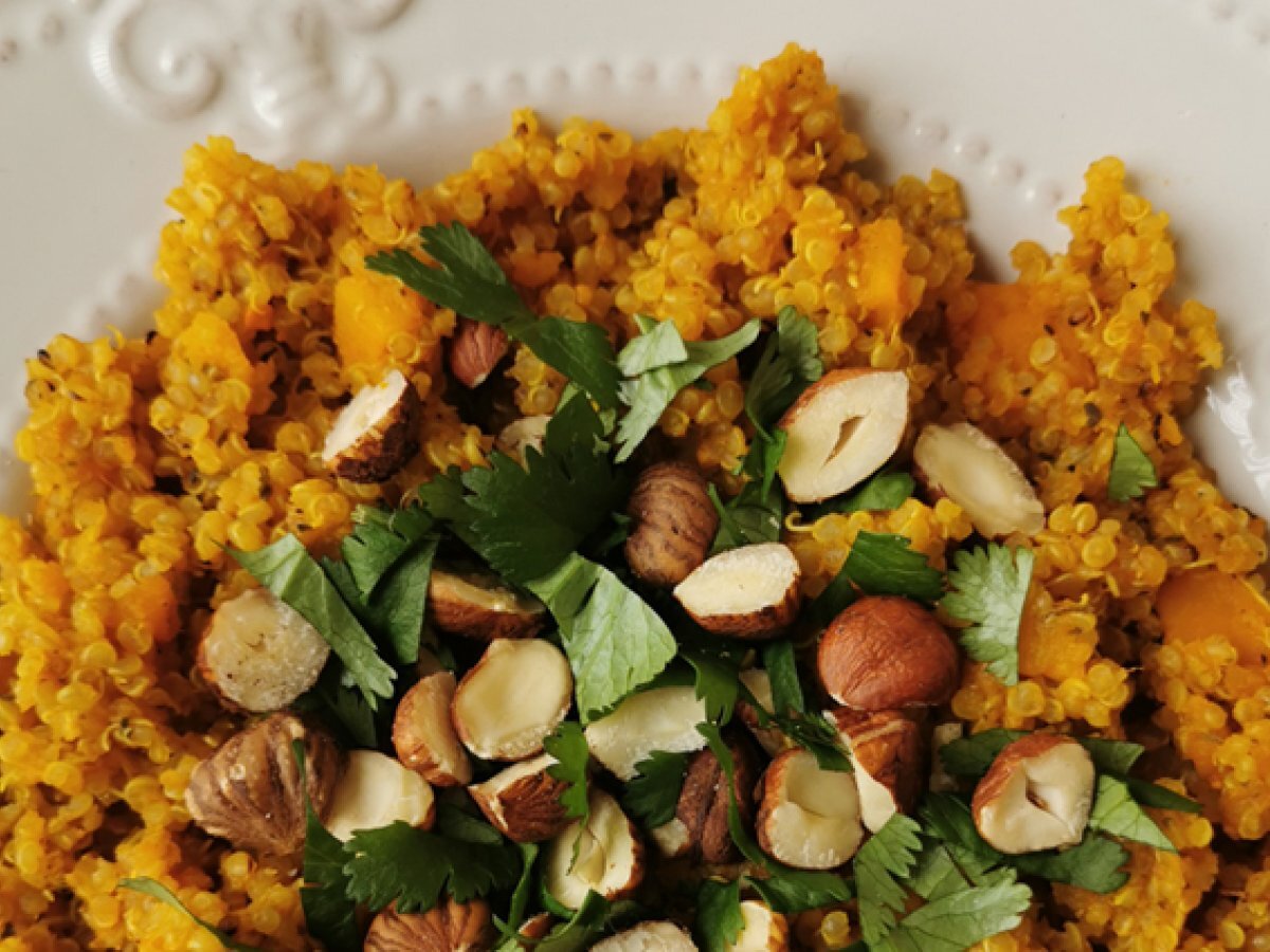 Vegetarisches risotto mit quinoa, butternut, haselnüssen und koriander - quinotto