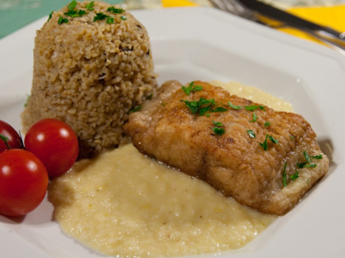Wels gebraten auf pastinakenpüree mit orientalischem bulgur