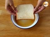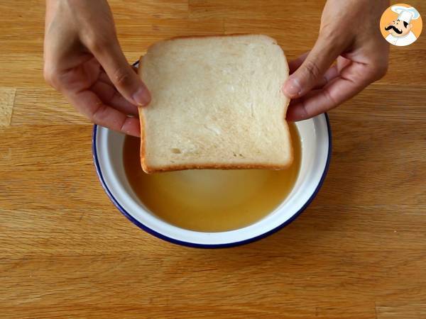 Das Semmelbrot in Bier tauchen und die Scheibe in eine Welsh-Schüssel geben. Legen Sie eine Scheibe Schinken darüber.