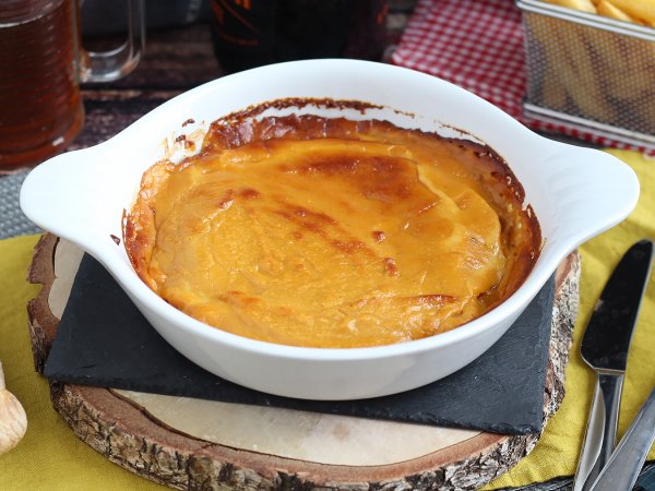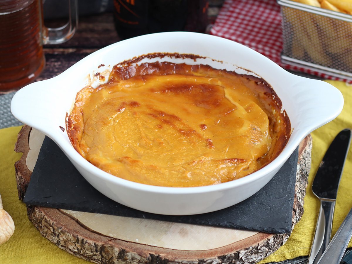 Die Hauptzutaten sind Cheddar-Käse, braunes Bier, Senfsuppe, Salz, Pfeffer, Grießbrot und Schinken.