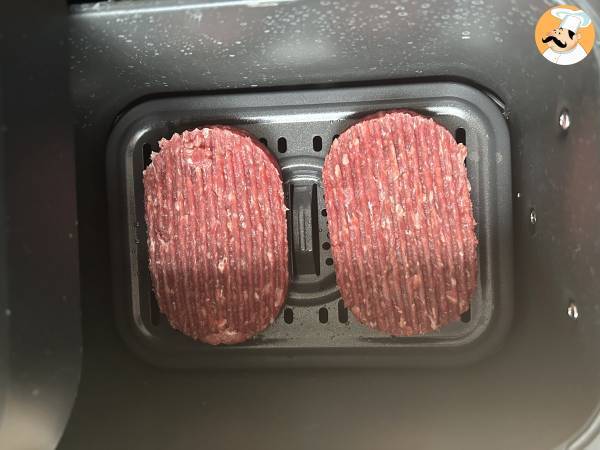 Legen Sie die Hacksteaks in die Schale des Air Fryers. Mit Salz, Pfeffer und einem Spray Olivenöl würzen und den Air Fryer für 10 Minuten bei 190°c starten.