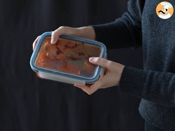 Den Behälter wieder verschließen und schütteln, um die Sauce gleichmäßig zu verteilen. 30 Minuten bis 1 Stunde kühl stellen.
