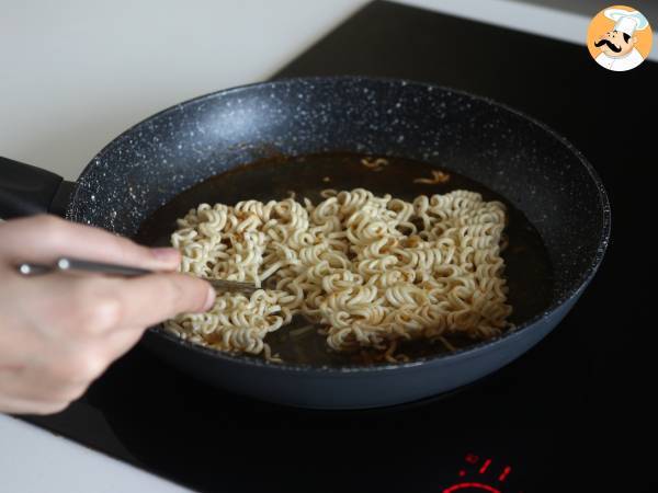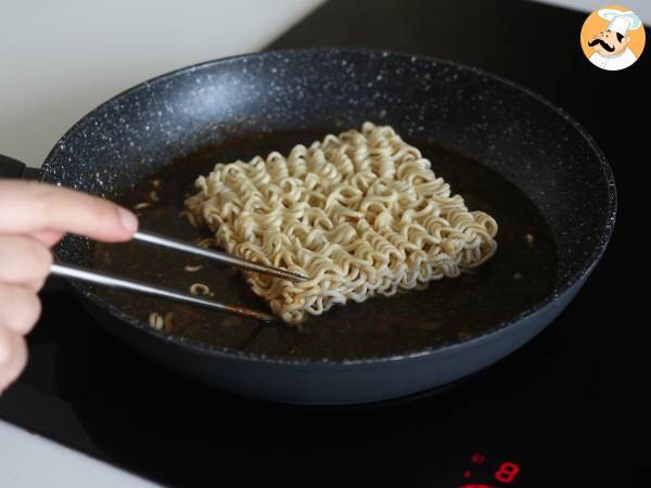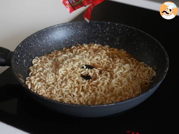 Geben Sie die Hälfte des roten Beutels der Nudelpackung (die Chilisauce) hinzu.